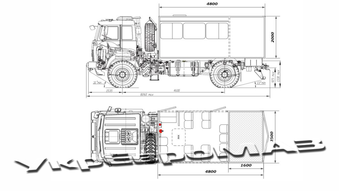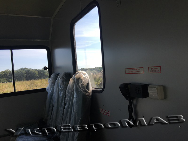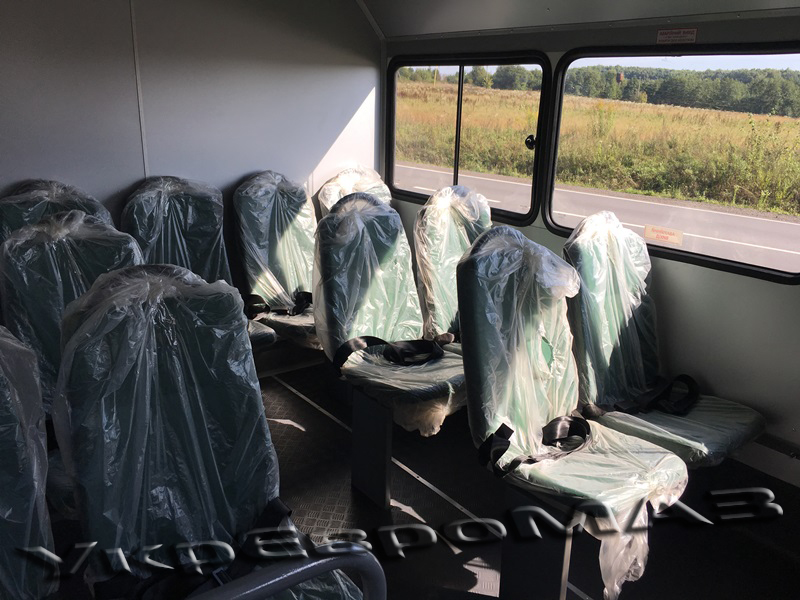 Підлога пас. відсіку: фанера вологостійка 20мм, покриття – протиковзаючий автолін. стіни, стелю: алюмокомпозитна панель товщиною 3 мм. Електроживлення: 24В від електромережі автомобіля. Освітлення фургона світильники салону 24В – 6 шт. (Пасс. відсік – 2 шт., Вант, відсік – 2 шт.), Верхні габаритні вогні – 4 шт. Габаритні розміри фургона (мм.): Довжина – 4800 ширина – 2500 висота – 2000 Комплектація: кількість місць – 15 шт .. (СПН-1, обшивка зносостійка вінілшкіра, обладнані двоточковими ременями безпеки) вікно глухе (1000 х 645 мм.) – 1 шт. вікно зі зсувним склом (1000 х 645 мм.) – 3 шт. вікно глухе (585х 645 мм.) – 1 шт. вікно двері (605 х 540 мм.) – 2 шт. пасажирські двері зі сходами автобусного типу покриті рифленим алюмінієм, обладнані поручнями і ліхтарем – 1 к-т. двері аварійні – 1 шт. двері вантажного відсіку – 1 шт. вентиляційний люк (аварійний вихід) – 1 шт. подвійна система опалення: від автономного повітряного опалювача «Планар – 8Д» 8 кВт. від системи охолодження двигуна з двома радіаторами обігріву 12 кВт. переговорний пристрій (тип кузов кабіна) – 1 к-т, сигналізатор «відкриті двері» – 2 шт. вогнегасник ВВК-3,5 з кріпленням – 1 к-т. кріплення під аптечку – 1 шт. ящик підкузовний для інструменту та інвентарю (пластиковий) – 2 шт. Для зручного входу і виходу пасажирів передбачені підніжки з рифленого металу, жорстко прикріплені до основи кузова-фургона. Проводиться антикорозійна обробка металевих поверхонь кузова-фургона.