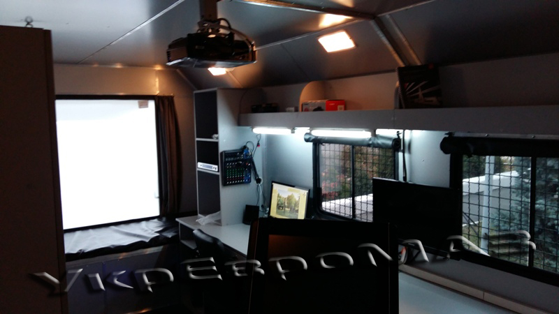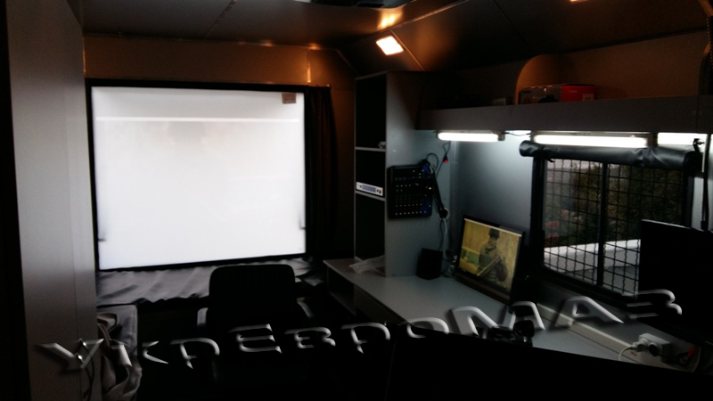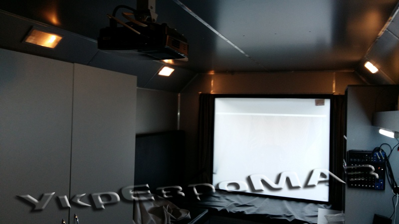 Вікно глухе 1 шт. (1400х1200мм.) розташоване на задній стінці фургону, виконує функцію екрана проектора. З зовнішньої сторони вікно захищене металевим люком, який відкидається вгору за допомогою телескопічних амортизаторів.
