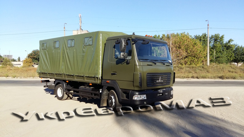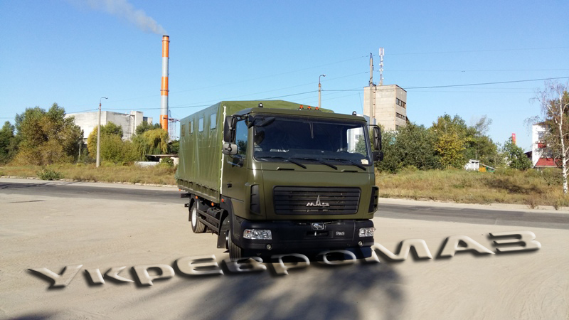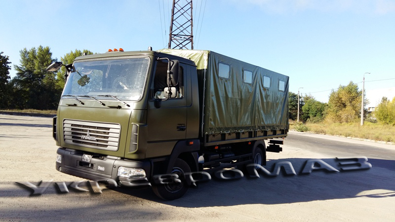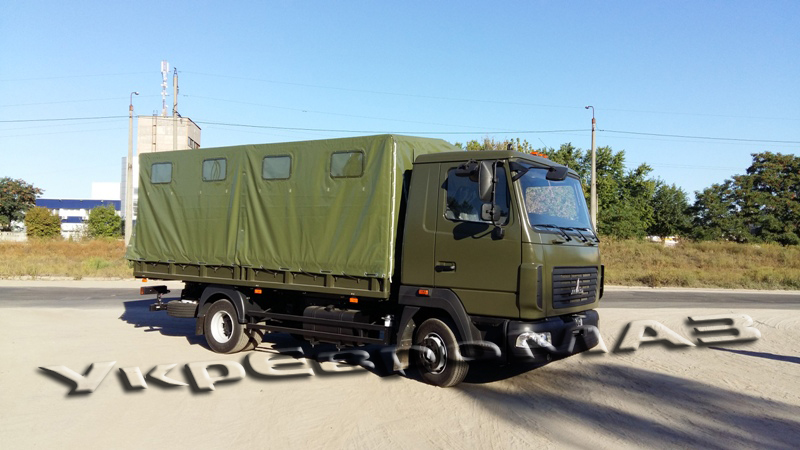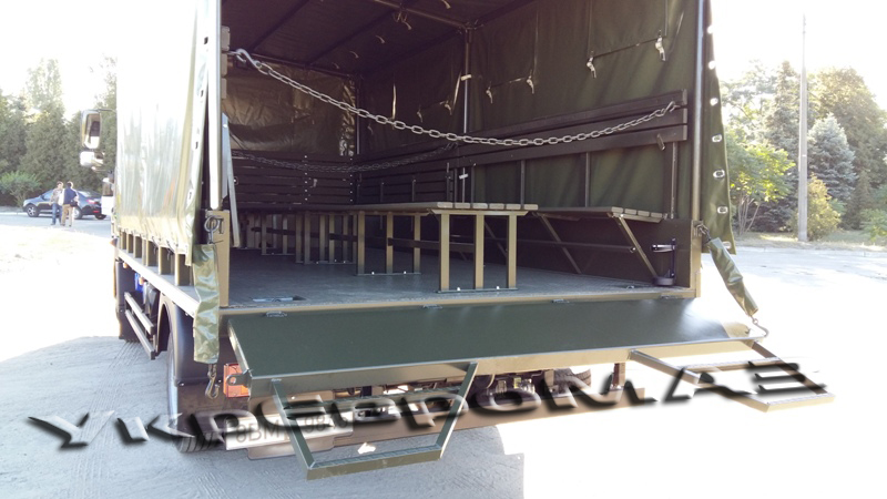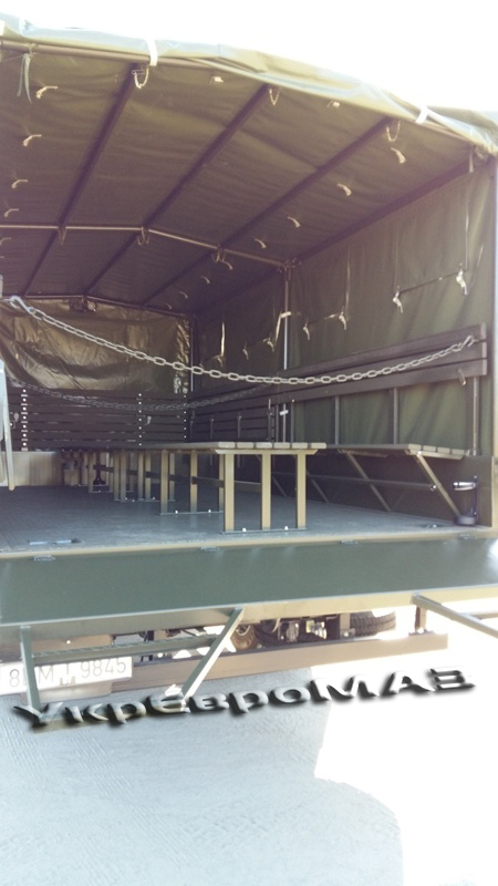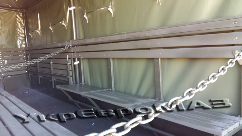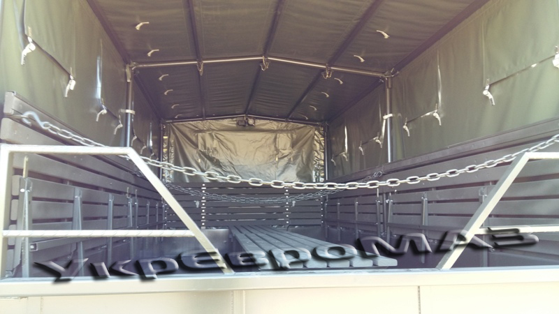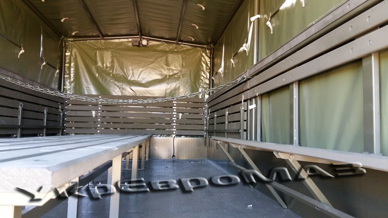 | платформа | Суцільнометалева, з бічними що не відкриваються бортами, з тентом (тентова тканина типу «Теча» з ПВХ покриттям). Настил платформи – сталевий лист з рифленням. Встановлюються відкидні лавки шириною 360мм уздовж бічних бортів (упори лавок з’єднані профілем для одночасного опускання на підлогу платформи), центральна лава шириною 535мм з болтовим кріпленням до підлоги. Встановлюється внутрішнє освітлення і кнопка виклику водія. На платформі встановлено кронштейн для кріплення другого вогнегасника ОУ-2 і додаткової медичної аптечки. Задній борт обладнаний підніжками для зручності посадки-висадки, а також упорами борту у відкритому положенні. Передній і бічні борти з латами. Внутрішні розміри платформи (ДхШхВ) 4900x2260x1900мм. На передньому запоні встановлено два клапана; на задньому – одне вікно; на бічних – чотири вікна з кожного боку.